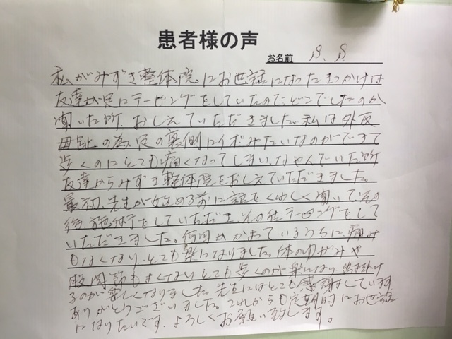 私がみすぎ整体院にお世話になったきっかけは、友達が足にテーピングをしていたので、どこでしたのか聞いたところ教えていただきました。私は外反母趾のため、足の裏側にタコみたいなのができて、歩くのにとても痛くなってしまい、悩んでいた所、友達からみすぎ整体院を教えていただきました。最初、先生が始める前に話を詳しく聞いて、その後施術とテーピングをしていただきました。何回か通っているうちに痛みもなくなり、とてもラクになりました。体の歪みや股関節もよくなり、とても歩くのがラクになり出かけるのが楽しくなりました。先生には、とても感謝しています。ありがとうございました。これからも定期的にお世話になりたいです。よろしくお願いいたします。