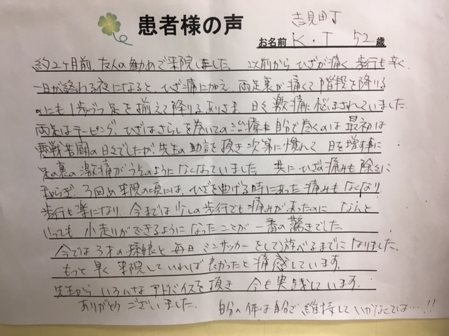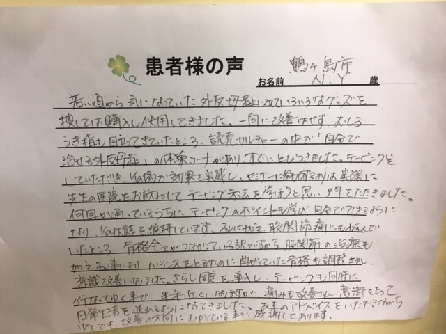メッセージ:初めてカルチャー教室でお会いした時のことを今でもよく覚えています。テーピングをした時のYさまの喜びが今でも忘れません。また、そこからの意識と行動が本当に素晴らしいと思いました。当院に通われてからも、テーピングの貼り方やセルフケアのやり方など熱心に学ばれていました。お身体の変化も少しづつ出てきて、本当に良かったですね。これからもセルフケアを忘れずにしっかりお願いします。院長 田上