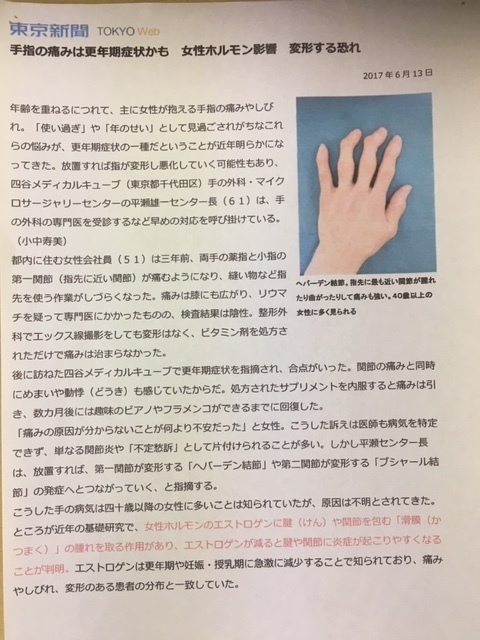 こんな記事を見つけましたのでまとめてみます。ここ数年私は、施術に入ると関節の変形や痛みでお悩みの方を多くみかけます。その方の足や手をみるとへバーデン結節がありました。